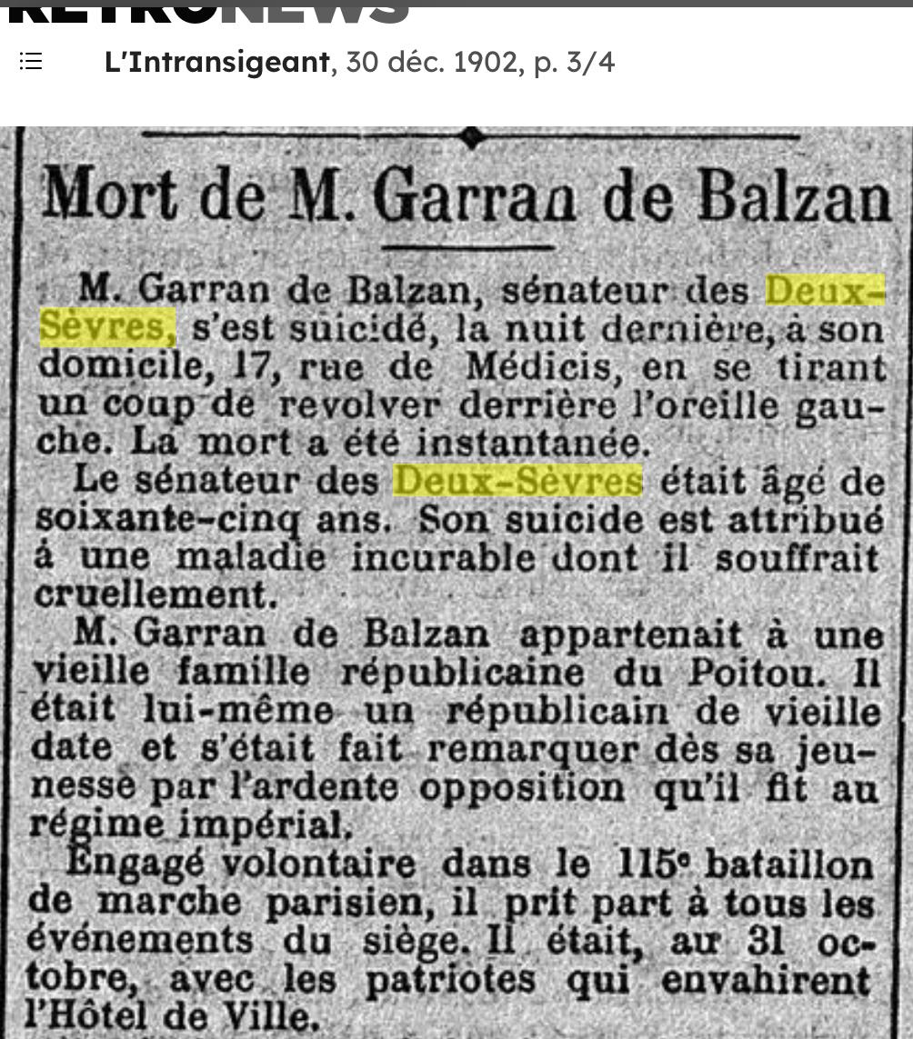 GARRAN DE BALZAN FRANCOIS GABRIEL EMILE NE A ST MAIXENT LE 30 JANVIER 1838 DECEDE A PARIS LE 28 DECEMBRE 1902 SENATEUR DES DEUX-SEVRES 1886-1902 REPUBLICAIN LIBRE PENSEUR. IL FUT LE PLUS HONNÊTE DES HOMMES |