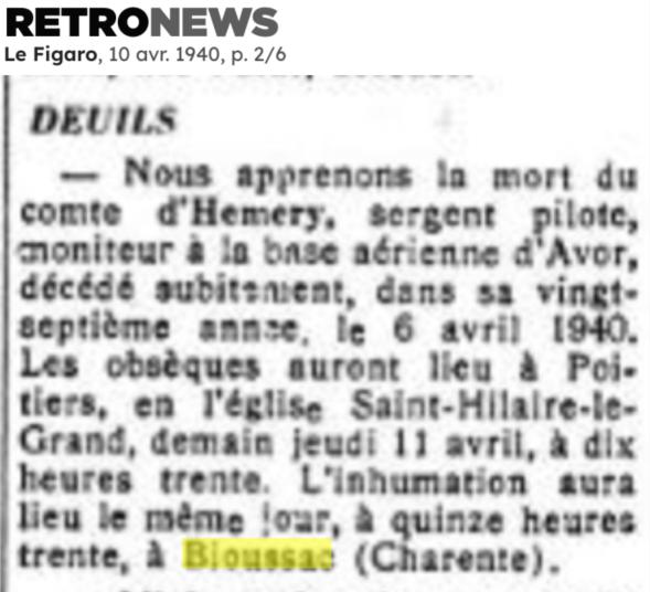 D'HEMERY NE LE 16 JANVIER 1914 MORT POUR LA FRANCE LE .. AVRIL 1940 REPOSE DANS LA PAIX DU SEIGNEUR PRIEZ