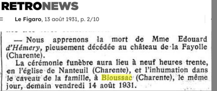 ICI REPOSENT FERDINAND POL D'HEMERY 5 JANVIER 1837 – 22 FEVRIER 1912 CONSTRUCTEUR DE L'EGLISE DE BIOUSSAC ET SON EPOUSE MARIE MATHILDE CECILE DESMIERS DE CHENON (15/09/1846 - ….) |