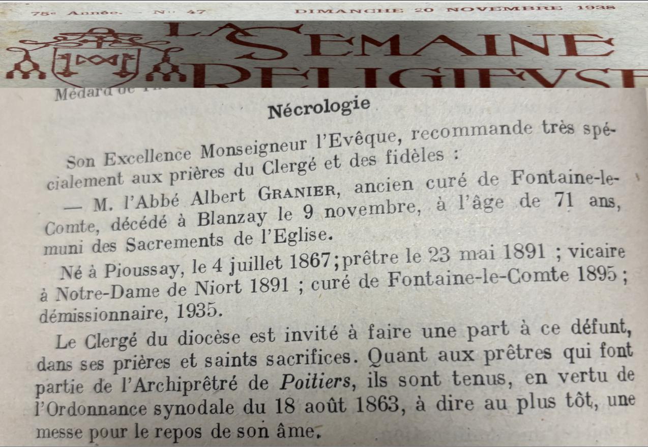 PRIEZ DIEU POUR ALBERT GRANIER Curé de FONTAINE le COMTE de 1895 à 1935 décédé à BLANZAY le 9 Novembre 1938 à l'âge de 71 ans
