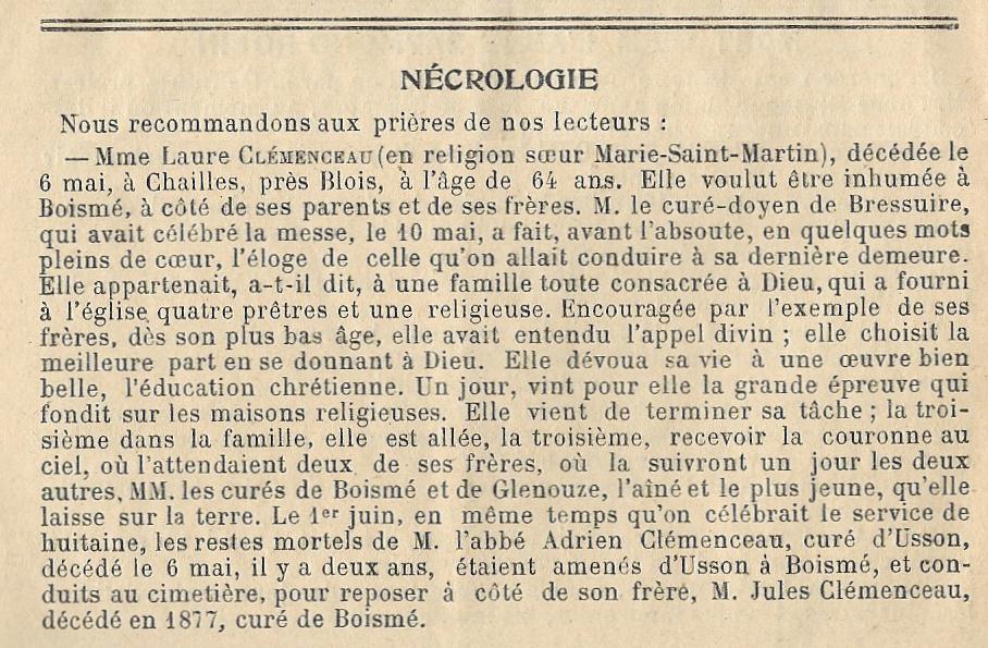 Ici repose le corps de l'abbé Ferdinand CLEMENCEAU Curé de Boismé 1877 – 1920 décédé le .. Février 1920 dans sa 77e année Reqiescat in pace