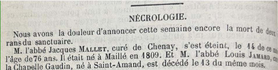 MALLé Jacques né vers 1809 dans le canton de SAINT SAVIN (86) DCD le 14/02/1885 à CHENAY curé de Chenay de 1881 à 1885. |