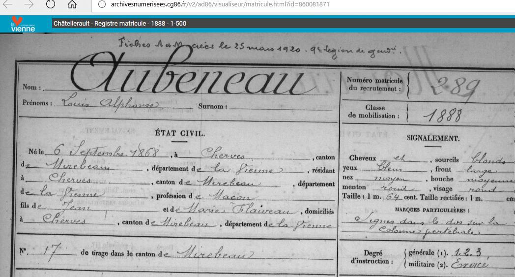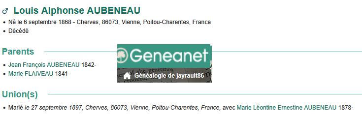 Union : Marié le 27 septembre 1897, Cherves, 86, avec Marie Léontine Ernestine AUBENEAU 1878-