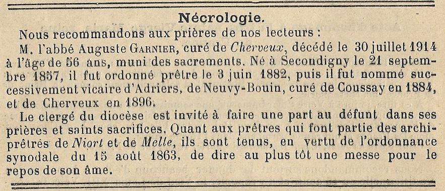 Tu es sacerdos in aeternum – Ici repose le corps de l'abbé A GARNIER Prêtre curé de Cherveux rappelé à Dieu le 30 juillet 1914 à l'âge de 56 ans