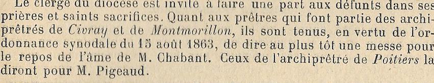 ICI REPOSENT en attendant la résurrection le corps de PIERRE THEOPHILE CHABANT Prêtre en religion Père LAZARE des Augustins de l'Assomption Né à Niort le 3 Juin 1842, décédé pieusement à Civray le 6 Mai 1909 au 43e anniversaire de son Ordination sacerdotale