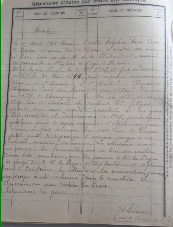 + DANS LA PAIX ICI Repose le corps de Delphin PAIN curé de François ancien curé de Clussais décédé le 1er Août 1919 à l'âge de 72 ans – Je vous ai choisi mon Dieu pour la part de mon héritage – Jésus – Marie – Joseph -- |