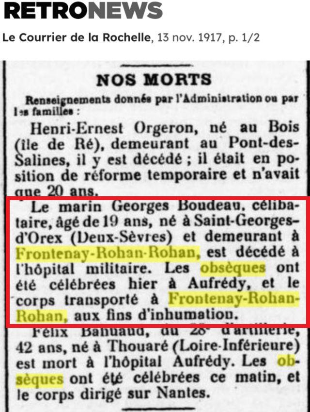 BOUDEAU Raymond Matelot télégraphiste - 4e D.E.F. + 10/11/1917 La Rochelle 17 79 - Frontenay-Rohan-Rohan - Monument aux Morts
