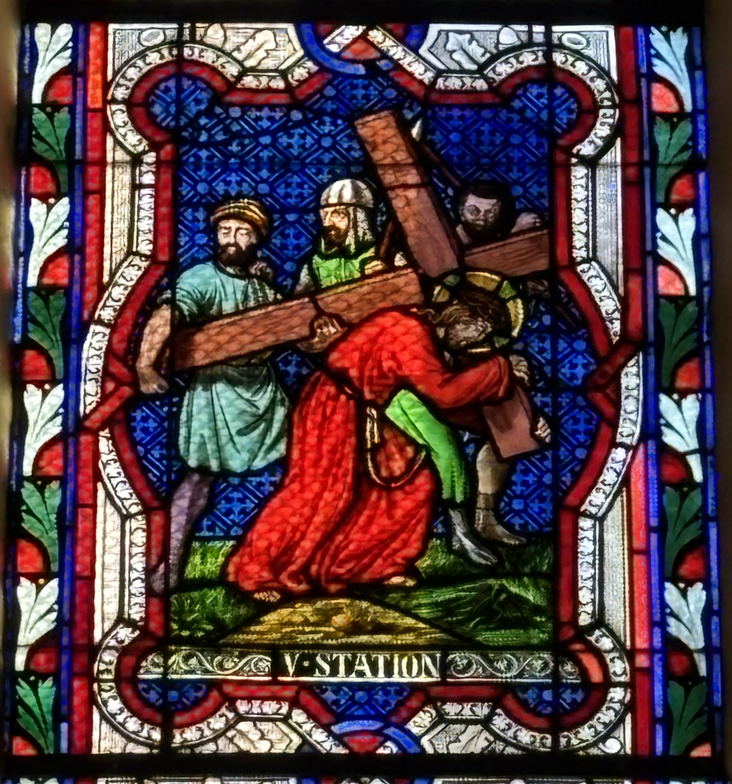5e station : Simon de Cyrène aide Jésus à porter sa croix. |