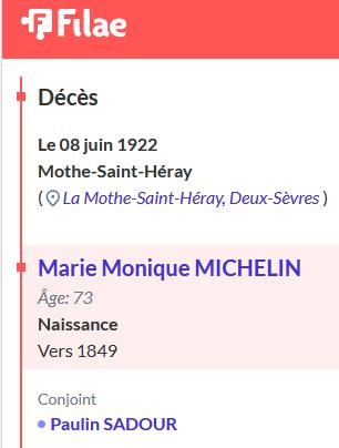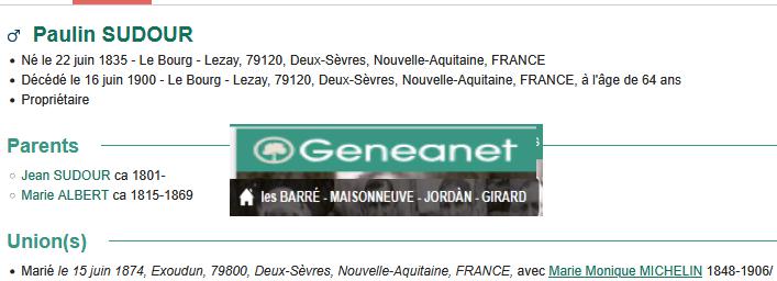 Ici repose le corps de Paulin SUDOUR époux de Marie MICHELIN décédé à Lezay le 17 Juin 1900 dans sa 63ème année muni des sacrements de l'église.