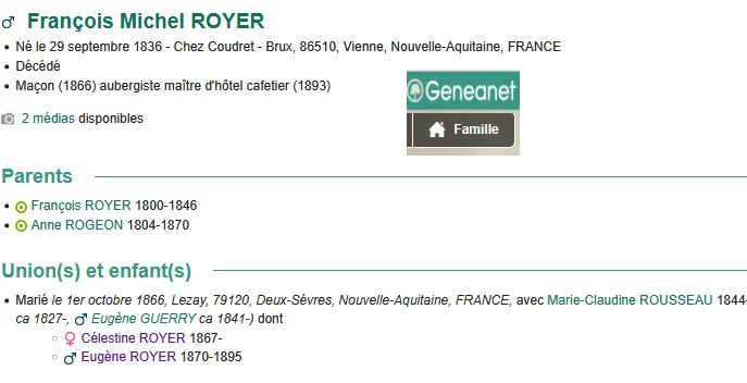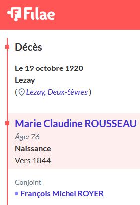 Ici repose le corps de Michel ROYER époux de Marie ROUSSEAU décédé à lezay le 13 Avril 1911 à l'âge de 74 ans Il fut bon époux et bon père -- |