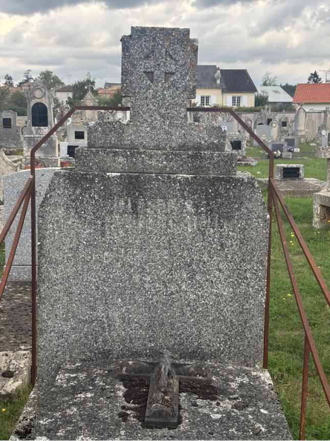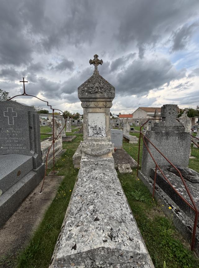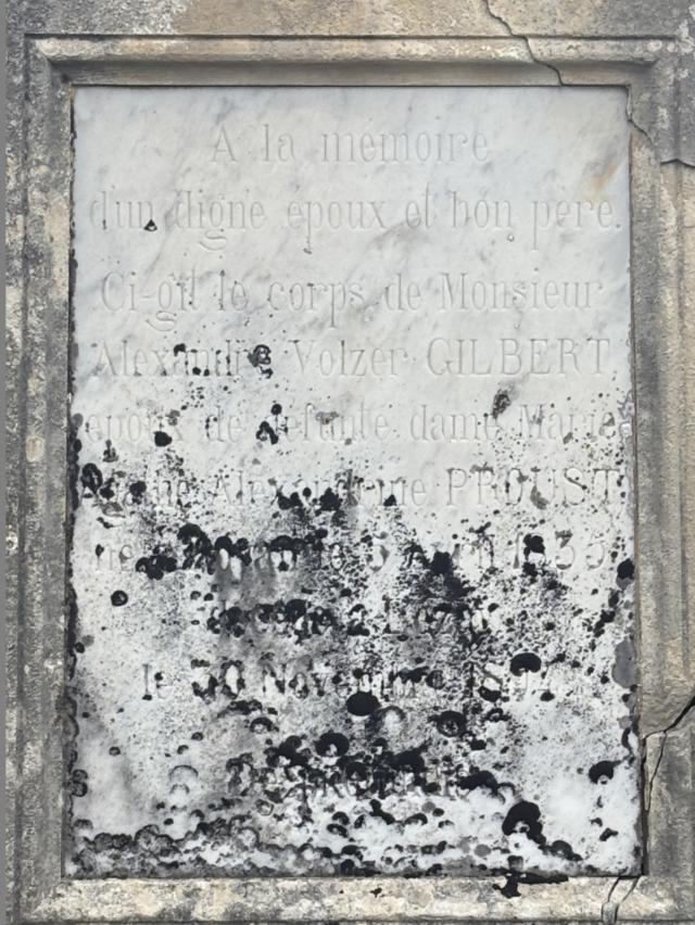 A la mémoire d'un digne époux et bon père Ci git le corps de monsieur Alexandre Volzer GILBERT époux de défunte dame Marie Agathe Alexandrine PROUST né à .. le 5 Avril 1835 décédé à Lezay le 30 Novembre 1894
