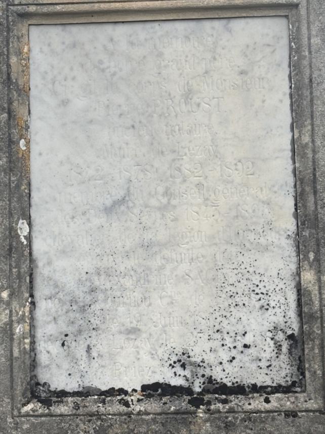 A la mémoire de notre grand père Ci git le corps de Monsieur Pierre PROUST ancien notaire maire de Lezay 1842 – 1878 1882 – 1892 membre du Conseil général des Deux Sèvres 1843 – 1895 chevalier de la légion d'honneur époux de défunte dame Alexandrine SAGET né au Courtiou Cne de Beaussais le 19 juin 1814 décédé à Lezay le 23 avril 1898