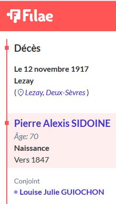 A LA MEMOIRE de Alexis SIDOINE Rté de Grie Dré Mlle Mre décédé à Lezay le 12 9bre 1917 dans sa 70ème année |