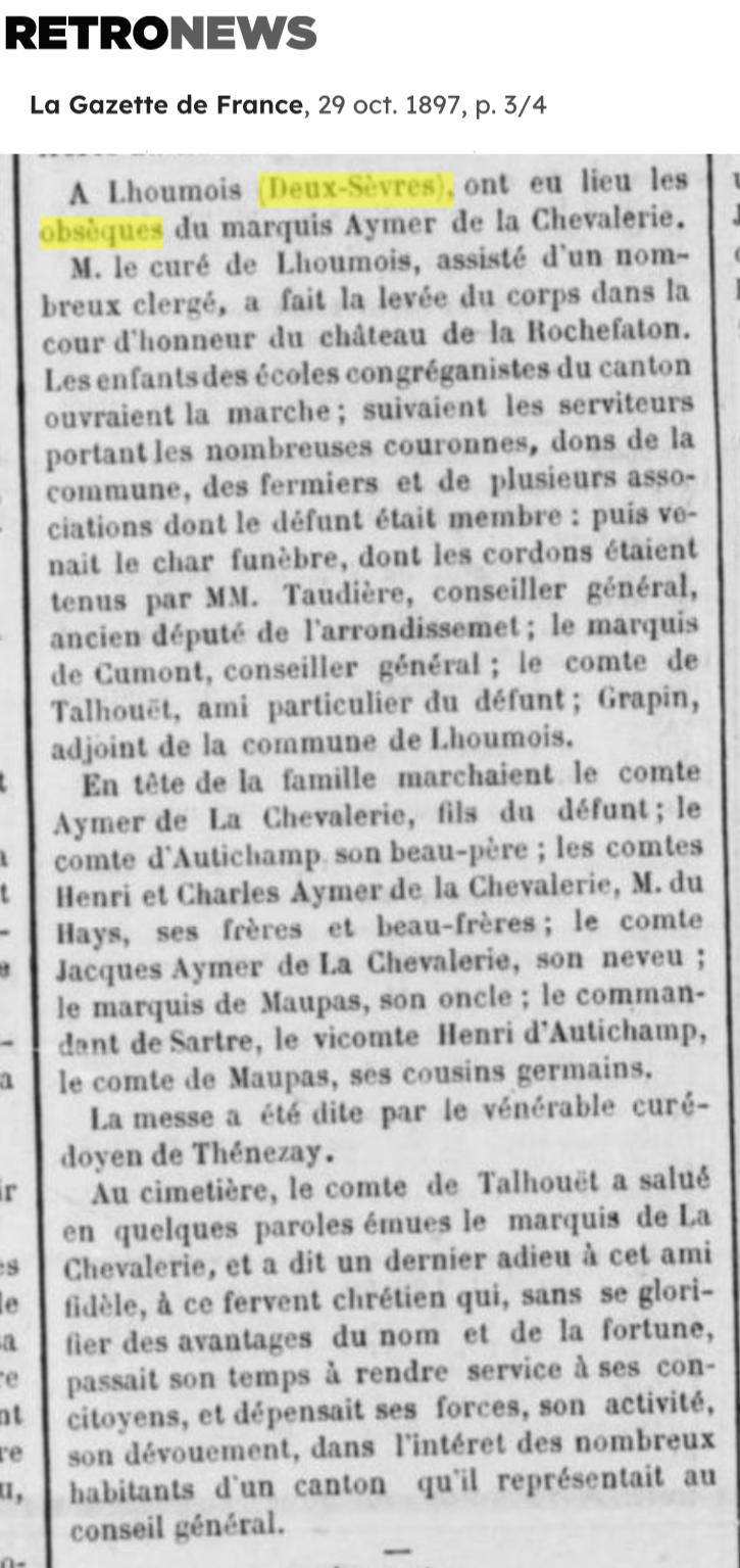 Ici reposent les corps de Henri Joseph René Marquis AYMER de la CHEVALERIE décédé le 18 Octobre 1897 âgé de 56 ans – Marie Gabriel Joseph AMBLARD Comte de BEAUMONT d'AUTICHAMP décédé le 21 Janvier 1902 âgé de 89 ans – Marie Augustine de BEAUMONT D'AUTICHAMP Marquise AYMER de la CHEVALERIE |