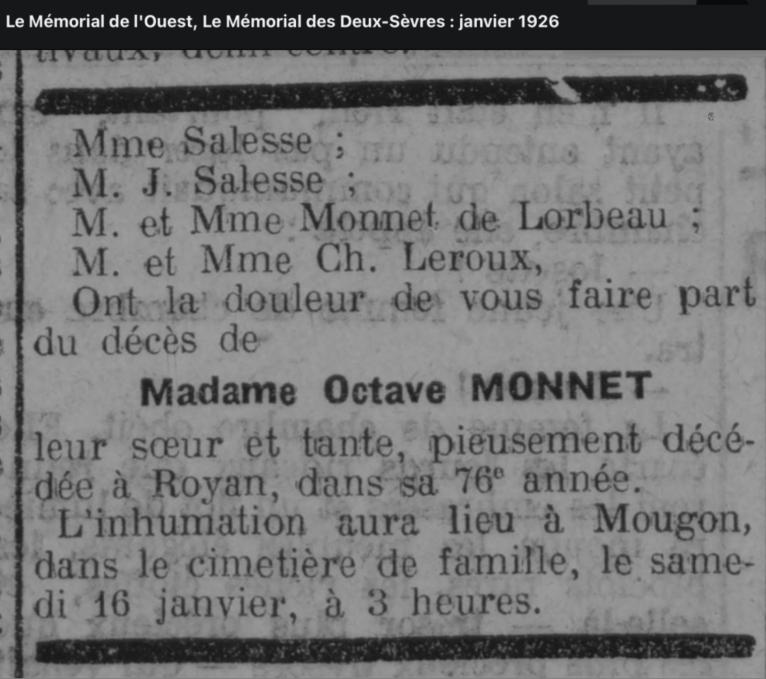 Ici repose la dépouille mortelle de Alfred MONNET né à MOUGON le 17 Xbre 1820. Ancien maire de Mougon, ancien maire de Niort. ancien député à l'assemblée Nationale, ancien Sénateur du département des Deux Sèvres Chevalier de la légion d'honneur décédé à Paris le 8 Juin 1890 à l'âge de 69 ans – Il avait pris la loi de Dieu pour règle de sa vie toute entière Priez pour lui.
