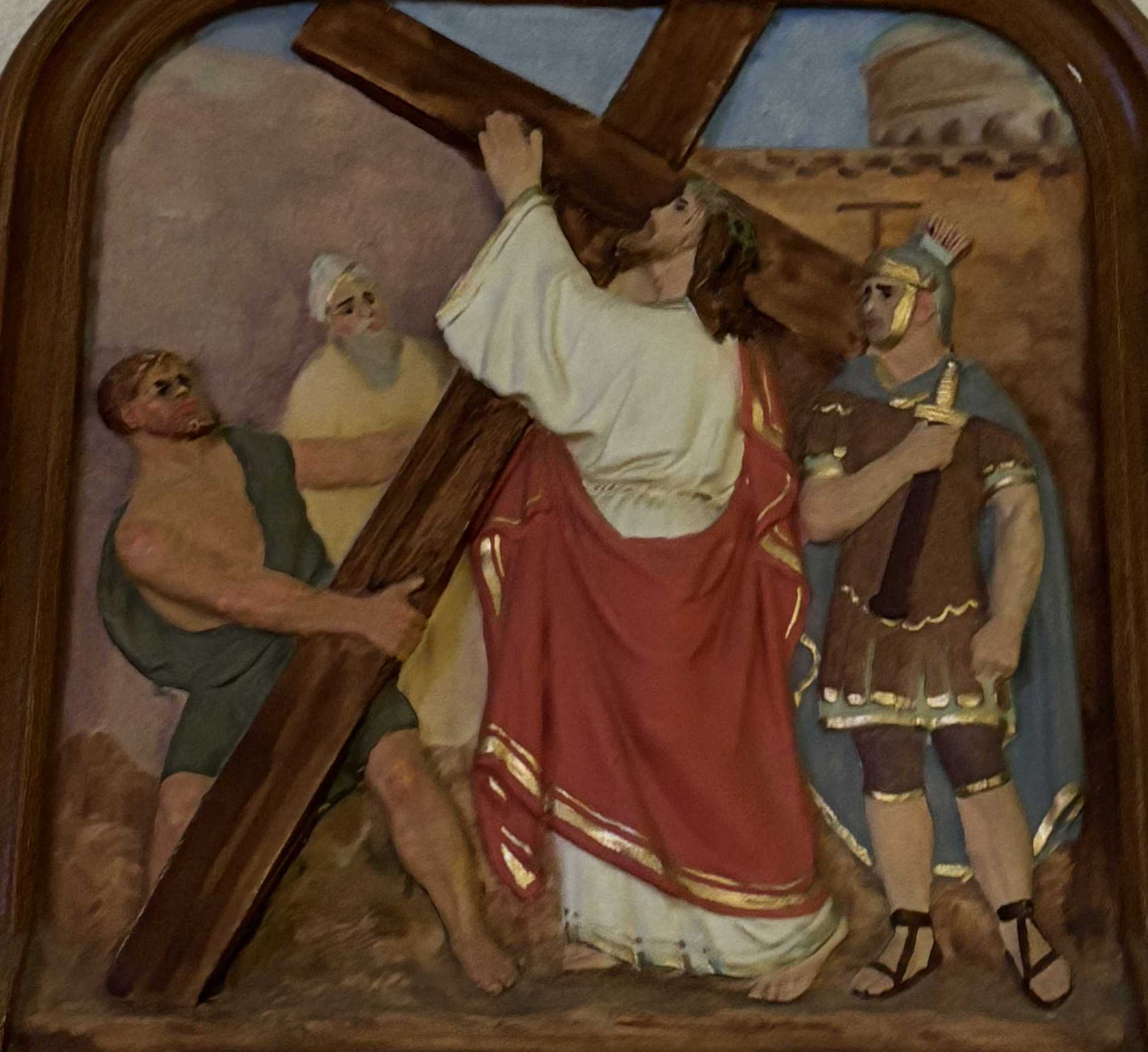5e station : Simon de Cyrène aide Jésus à porter sa croix. |