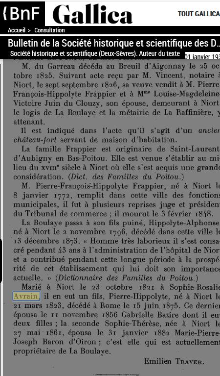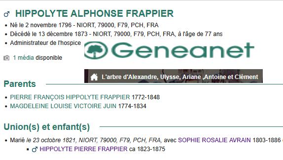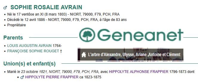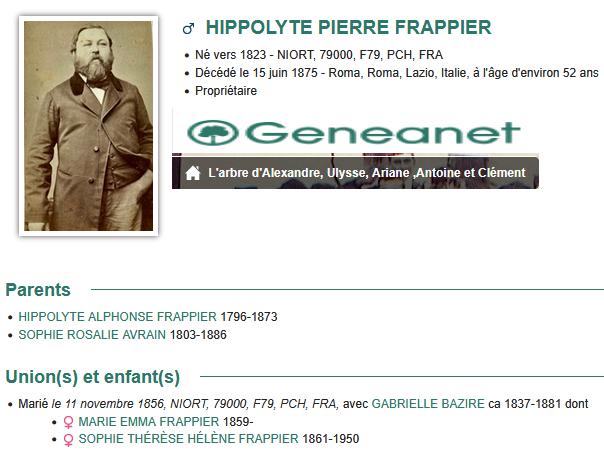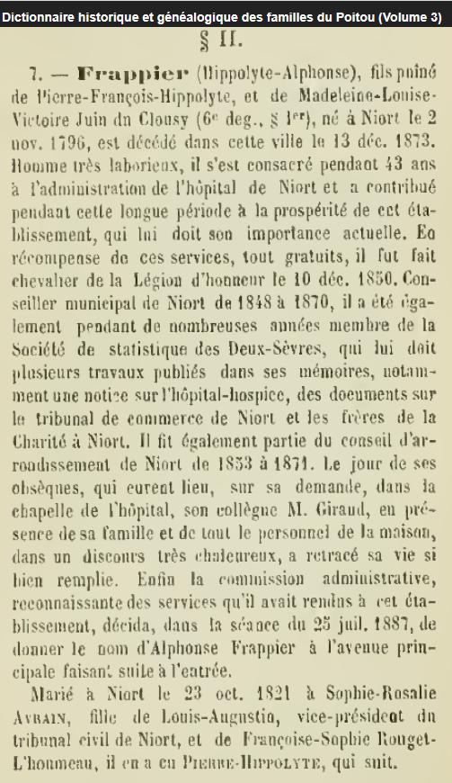 Hippolyte Alphonse FRAPPIER 77 ans 13 Décembre 1873 – Pierre Hippolyte FRAPPIER 52 ans 15 Juin 1875 – Sophie Rosalie AVRAIN Dame FRAPPIER 11 Avril 1886 –