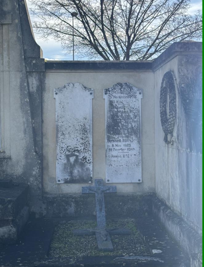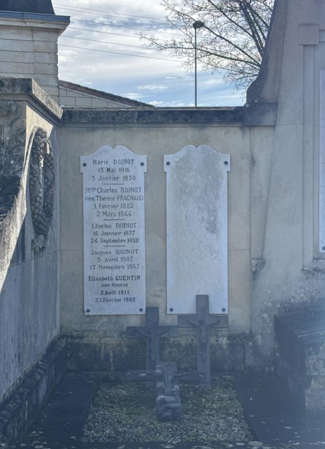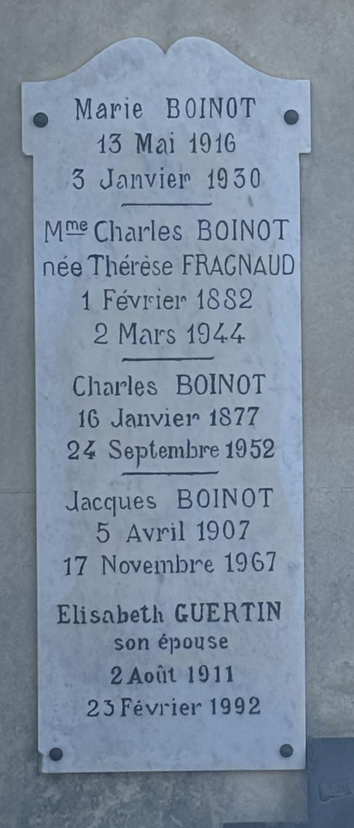 Marie BOINOT 13 Mai 1916 3 Janvier 1930 – Mme Charles BOINOT née Thérèse FRAGNAUD 1 Février 1882 2 Mars 1944 – Charles BOINOT 16 Janvier 1877 24 Septembre 1952 – Jacques BOINOT 5 Avril 1907 17Novembre 1967
