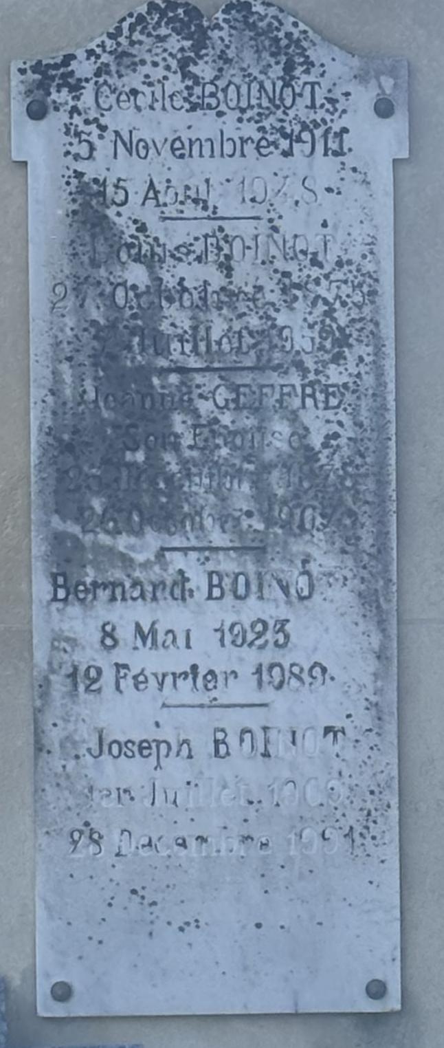 Cécile BOINOT 5 Novembre 1911 15 Avril 1948 – Louis BOINOT 27 Octobre 1875 . Juillet 1959 – Jeanne GEFFRE Son Epouse 25 Décembre 1878 26 Octobre 1967 – Bernard BOINOT 8 Mai 1923 12 Février 1989 – Joseph BOINOT 1er Juillet 1969 28 Décembre 1991 |