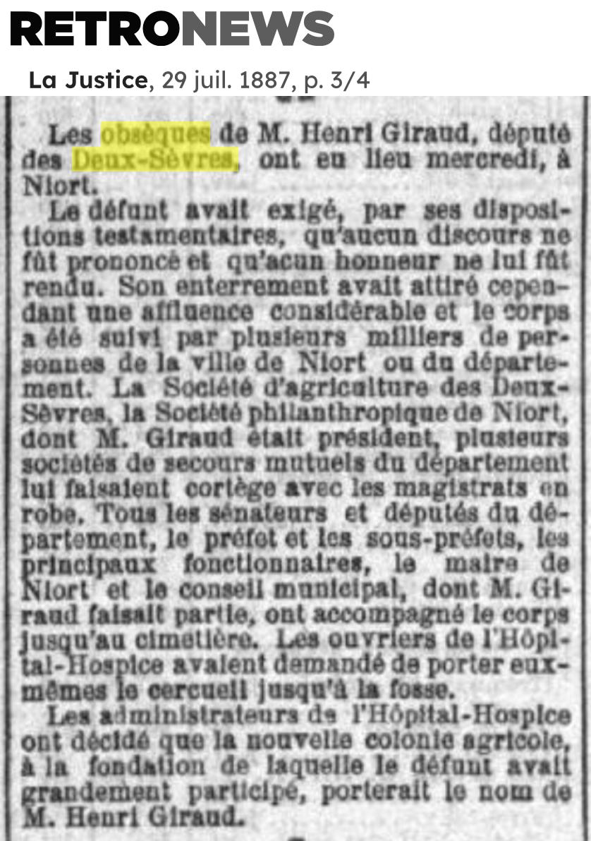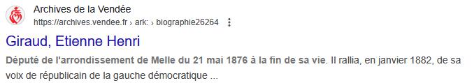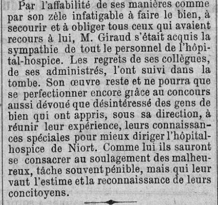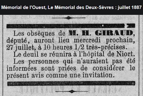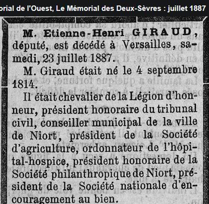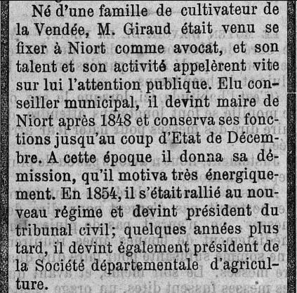Henri Giraud est reçu avocat en 1835 et inscrit au barreau de Niort, il est nommé juge puis président, durant vingt-deux années, au tribunal civil de la ville. Elu maire de Niort le 19 août 1848[[#ref_1]], il démissionna après le coup d'Etat du 2 décembre 1851. Giraud présida la Société d'agriculture des Deux-Sèvres et le comice agricole de Niort. Fondateur en 1857 du mensuel "La Fraternité", il est l'instigateur de la reprise éditoriale de l'Almanach de "Frère Jacques" - en mémoire de Jacques Bujault cultivateur à Sainte-Blandine. Député de l'arrondissement de Melle du 21 mai 1876 à la fin de sa vie. Il rallia, en janvier 1882, de sa voix de républicain de la gauche démocratique, celles des conservateurs dans un vote qui causa la chute du gouvernement de Léon Gambetta. Giraud a été en 1880 le rapporteur[[#ref_2]] sur la création d'un port en eau profonde à La Pallice près de La Rochelle. Ardent propagateur du mouvement mutualiste[[#ref_3]] et longtemps à la tête des secours mutuels de sa ville, il présida à Paris la Société d'encouragement au bien, et la Société philantropique du prêt gratuit, et assura la vice-présidence de la Société française des amis de la paix.
