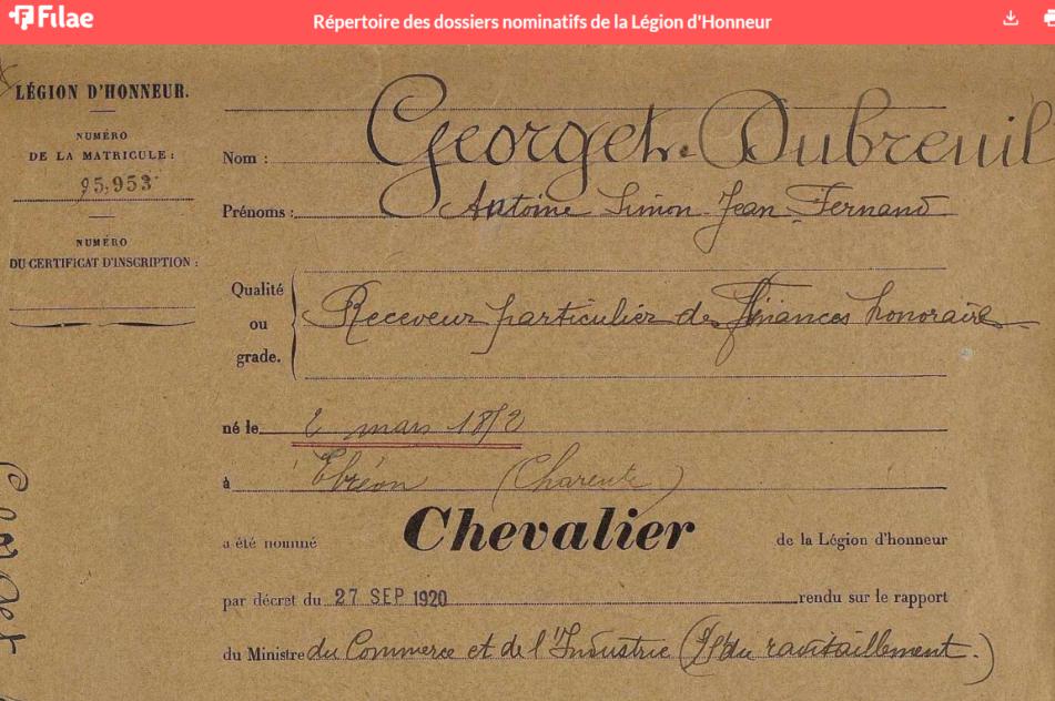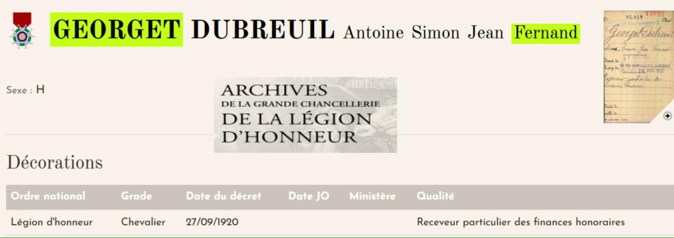 Fernand GEORGET-DUBREUIL Receveur … Chevalier de la Légion d'Honneur époux de... BOUTET … .. |