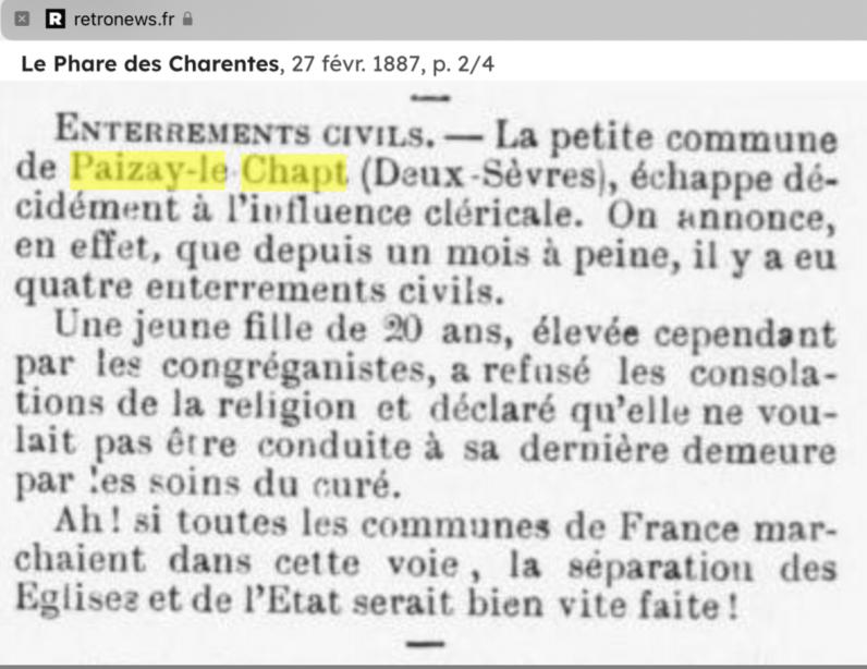 âgée de 20 ans domiciliée à Semoussais fille de BORDEAU Pierre et de PACAUD Marie née le 05/03/1856 à PAIZAY LE CHAPT |