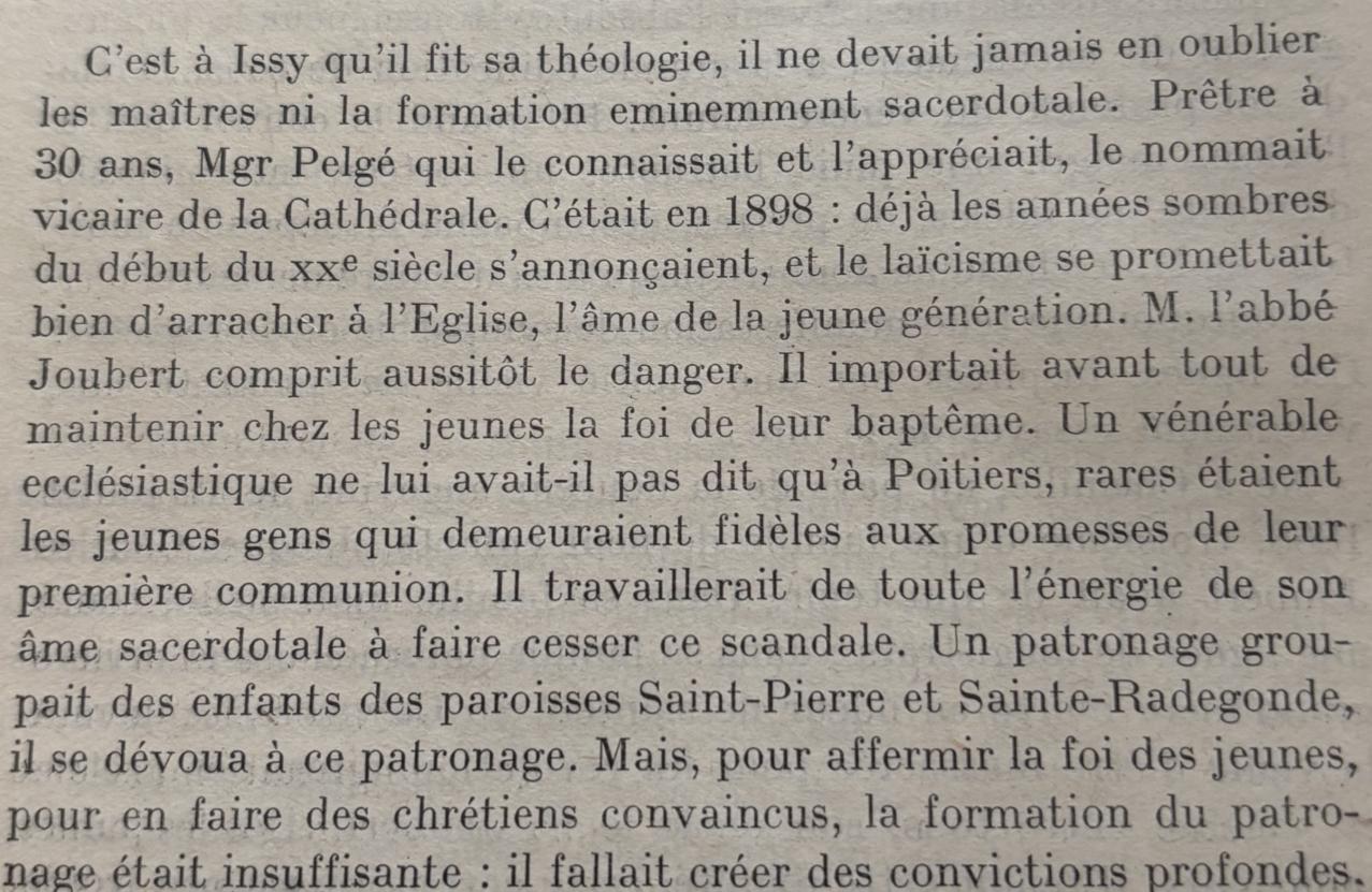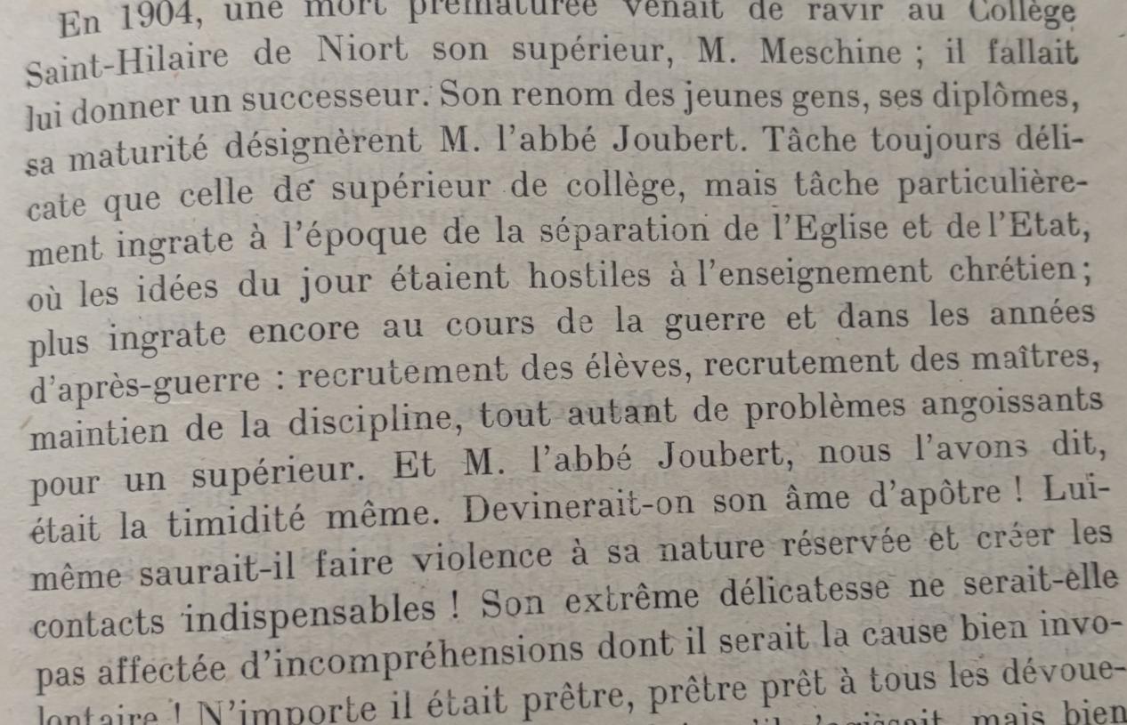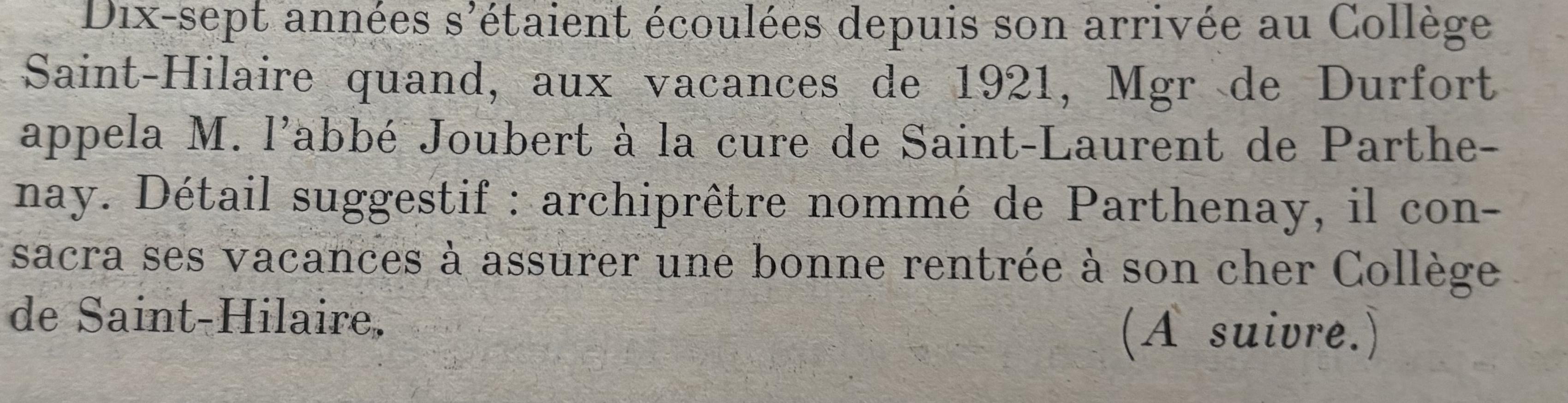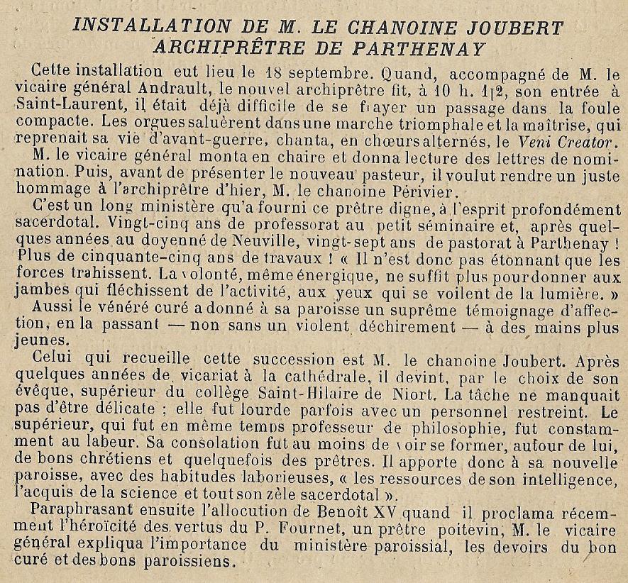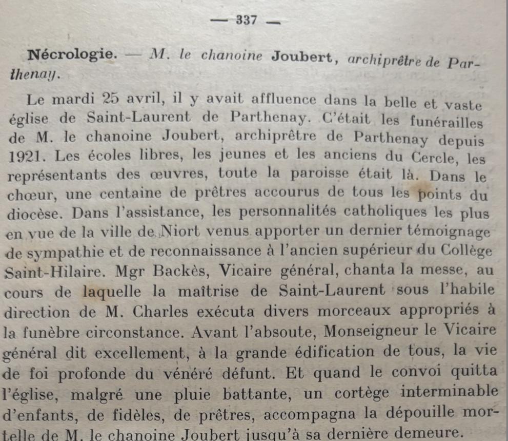 Ici Repose le corps de Mr l'Abbé Jacques JOUBERT Chanoine Honoraire Archiprêtre Curé de St Laurent de PARTHENAY pendant 18 ans décédé le 21 Avril 1939 à l'âge de 70 ans