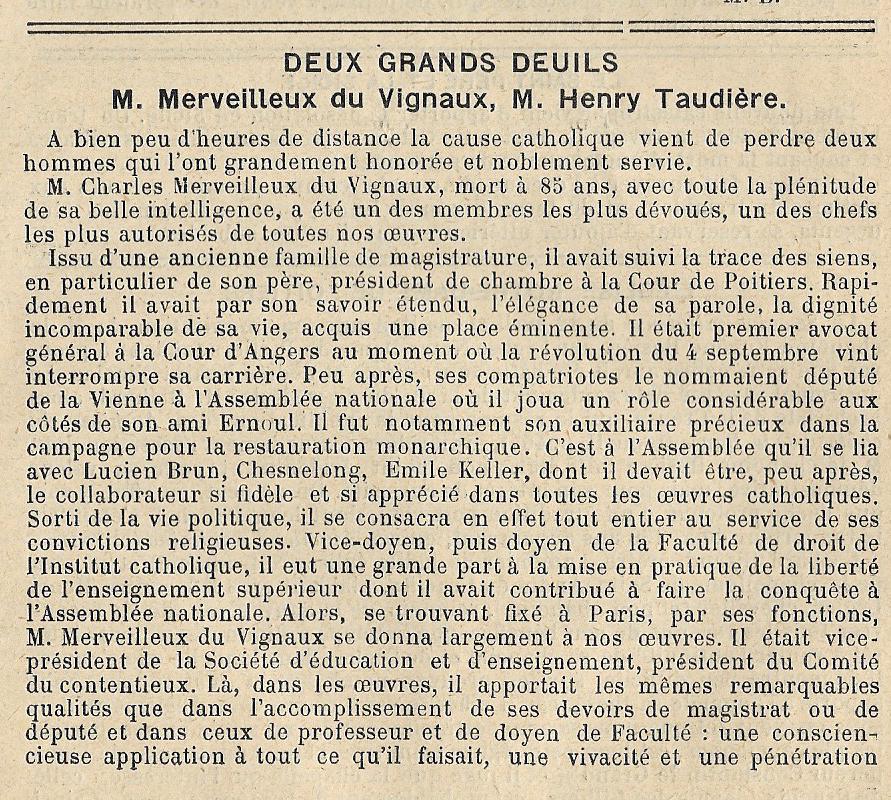 Marié le 25 mai 1857, Meaux, 77100, avec Marie Victoire Laure GUERIN 1837-1903 (Parents : Michel Jacques GUERIN 1806-1869 & Antoinette Victoire CHOISELAT 1814-1900) dont F Marie Mathilde Victoire TAUDIERE 1858- Mariée le 30 septembre 1878, Parthenay (Deux-Sèvres), avec Georges Joseph Edmond BRILLAUD ca 1850- H Jacques Henri TAUDIERE 1860-1914 Marié le 24 avril 1900, Paris, avec Emilie BRY ca 1875- F Joseph-Anne Elisabeth Pauline TAUDIERE 1872-