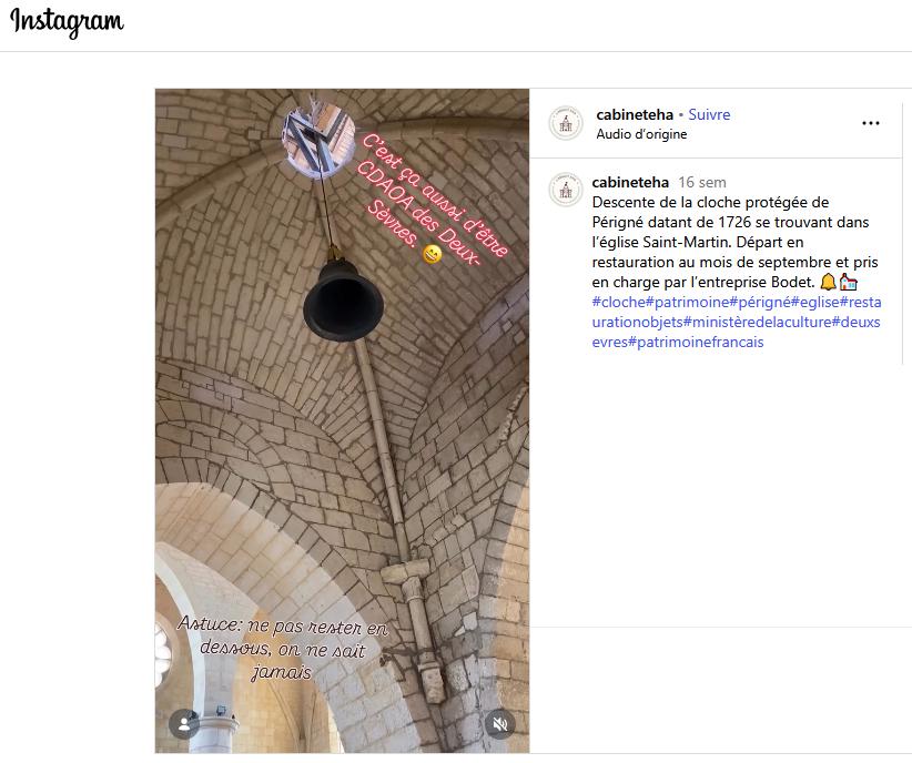 Sur les panneaux à l'arrière sont inscrits des généralités sur la restauration et l'histoire des cloches mais rien sur celle de PERIGNE (79) |