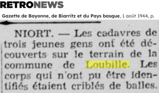Le 24 juillet 1944, 3 jeunes gens sont fusillés par les Nazis au Bois Cambert FOSSé Pierre Louis mort à 21 ans né le 13 janvier 1923 à MORTAFOND de NERE FFI inhumé à NERE (Charente Maritime) ==>