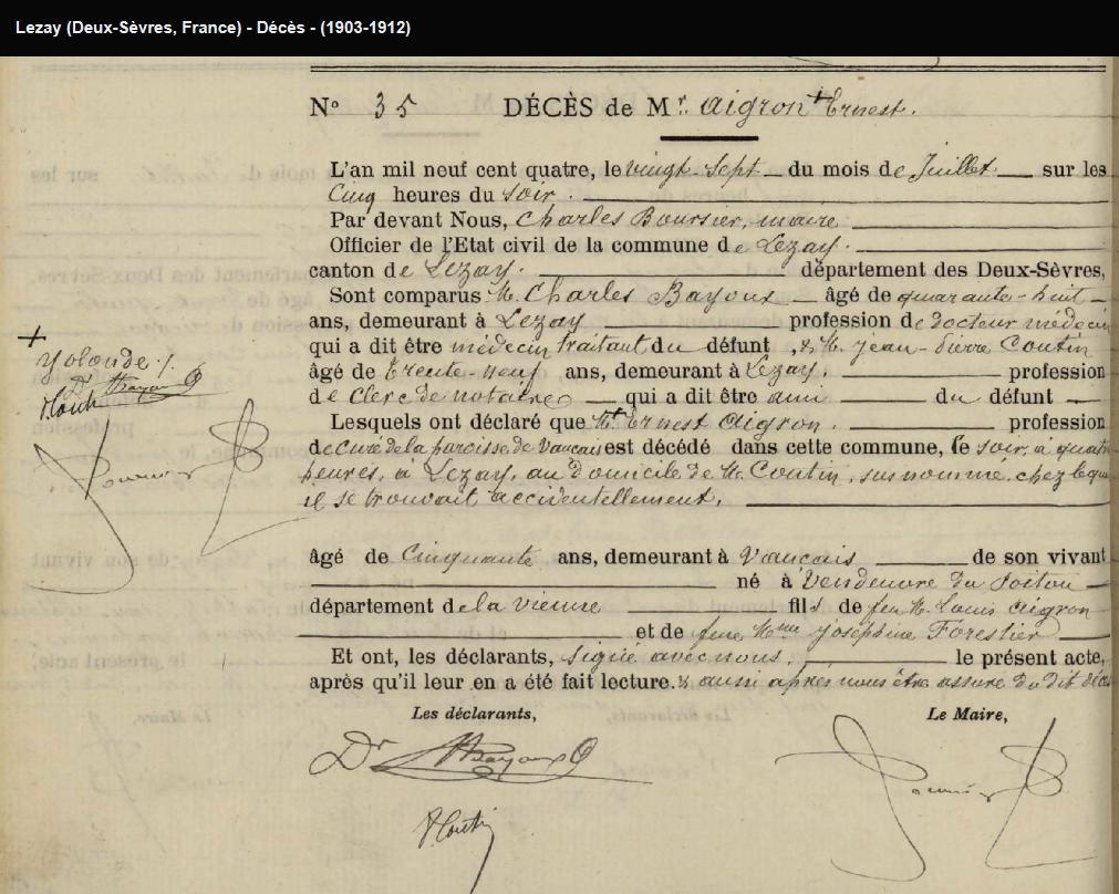 AIGRON Yolonde Ernest né à VENDEUVRE DU POITOU (86) DCD le 27/07/1904 à LEZAY 50 ans