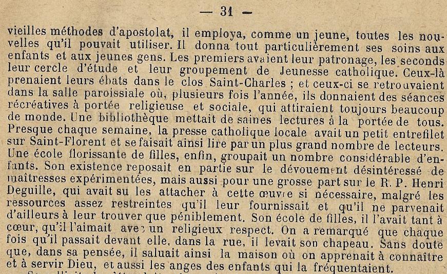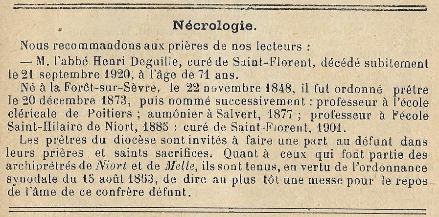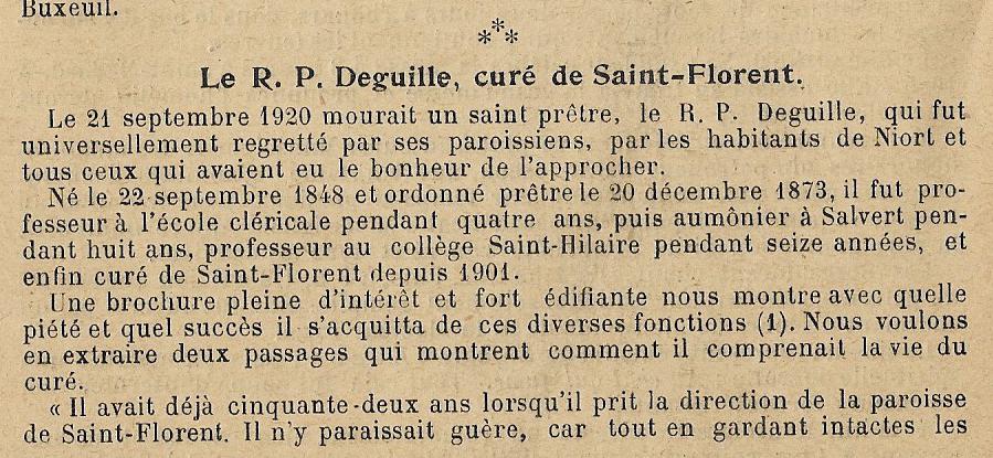 ICI REPOSE LE R.P. HENRI DEGUILLE Curé de cette paroisse pendant vingt ans Retourné à Dieu le 21 7bre 1920 dans sa 72ème année Que ceux dont il a été le père se souviennent de Lui dans leurs prières et se rappellent toujours ses deux paroles favorites « Aimer le Bon Dieu » « faites bien ce que vous faites » |