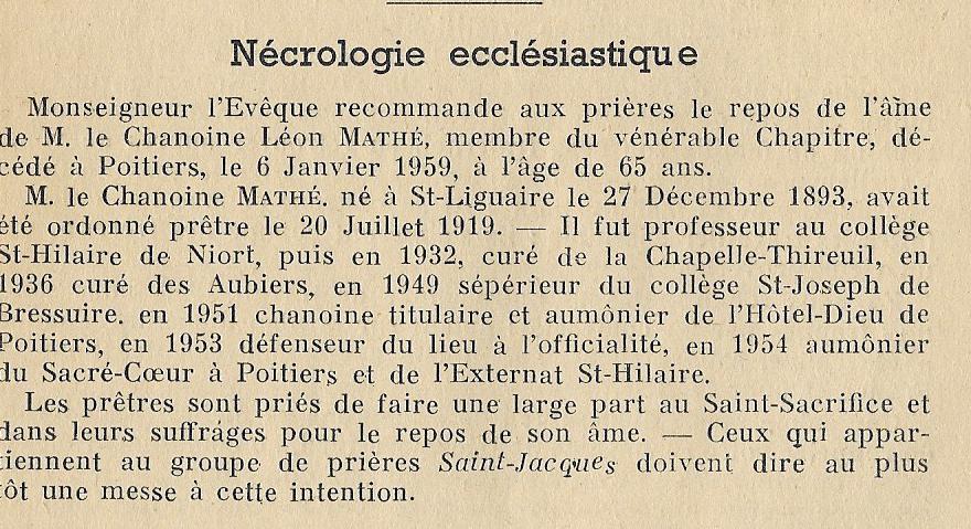 CHANOINE LEON MATHE CHANOINE TITULAIRE DE LA CATHEDRALE DE POITIERS NE A SAINT LIGUAIRE LE 27 DECEMBRE 1893 ET DECEDE A POITIERS LE 6 JANVIER 1959 A L'ÂGE DE 65 ANS PRIEZ POUR QUE LE SEIGNEUR QU'IL AVAIT CHOISI LUI PERMETTE DE PASSER SON CIEL A FAIRE DU BIEN SUR LA TERRE |