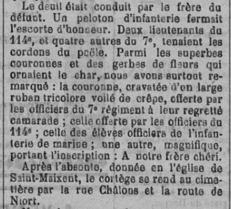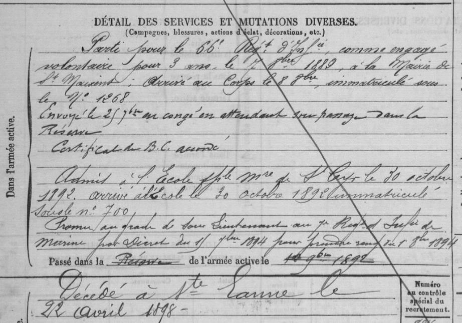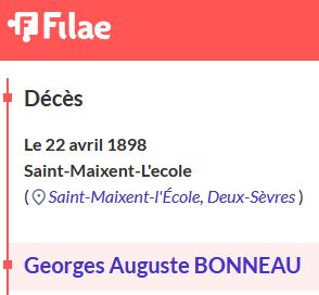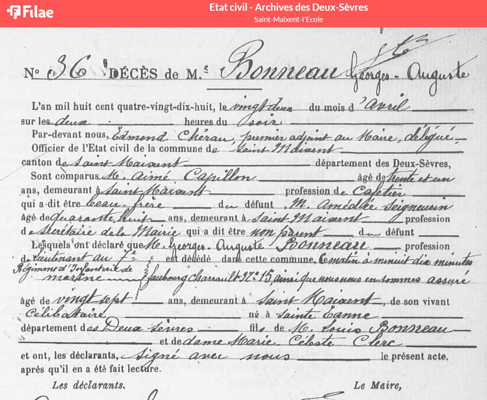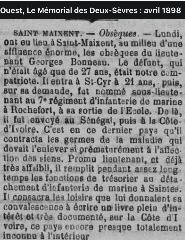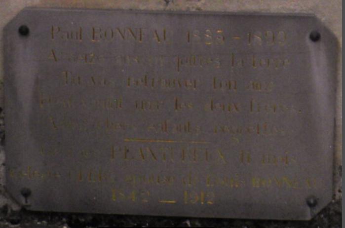 A la mémoire de Georges BONNEAU lieutenant d'infanterie de marine décédé le 21 Avril 1898 à l'âge de 27 ans – Ci repose spis cette pierre un brave .. Modeste … Aux douleurs aux regrets de sa famille .. Passants qui .. .. Pour ce vaillant soldat .. |
