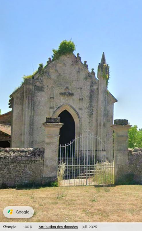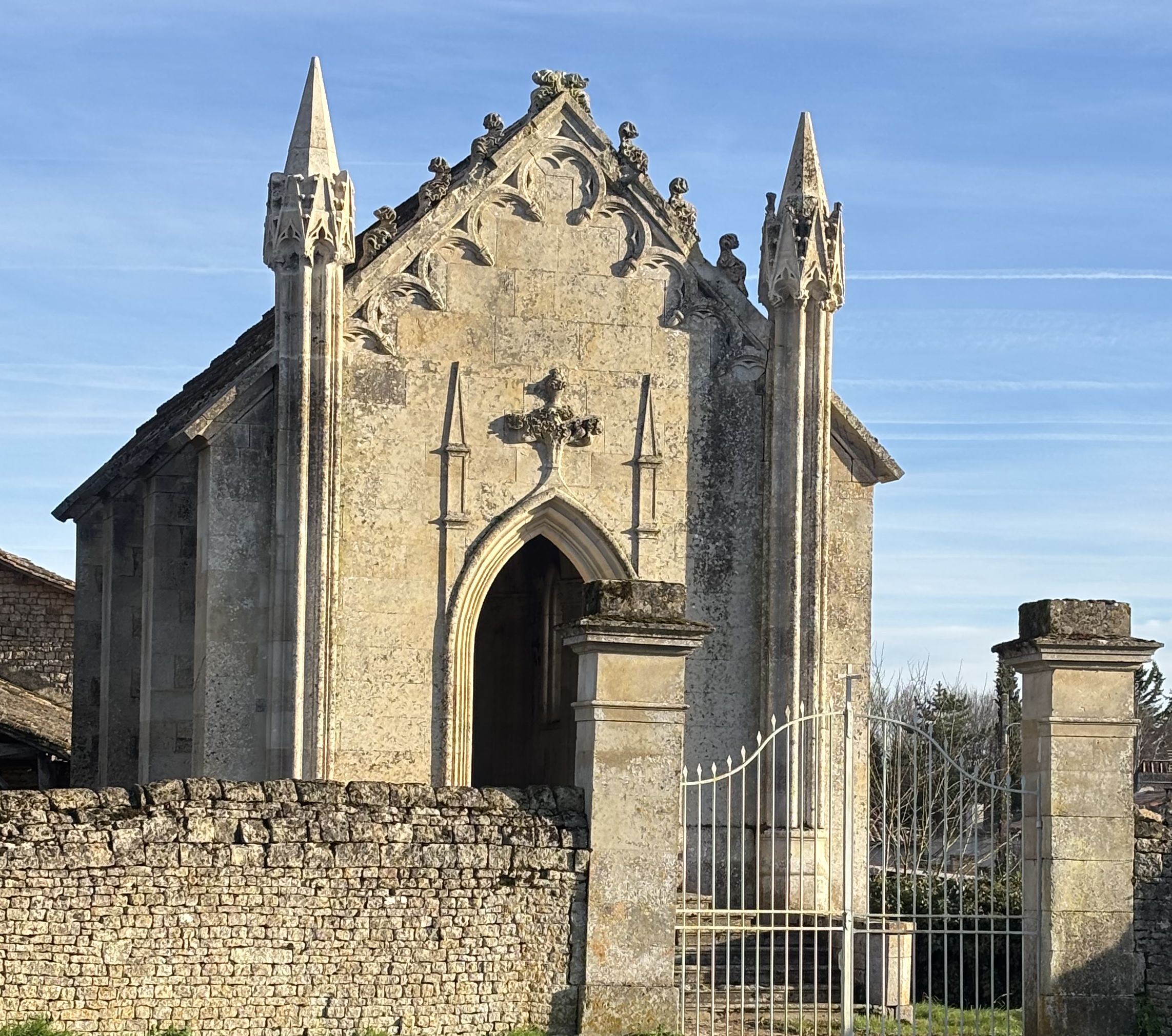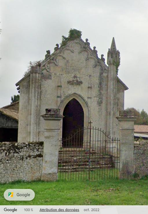 Extrait Base Mérimée « en 1842 la veuve de Louis Charles Auguste Prevost fait édifier une chapelle funéraire à la mémoire de son mari, dédiée à saint Louis et saint Augustin, cette chapelle est construite par Jean Dulin architecte départemental de la Vienne, des 1848 le service de cette chapelle est rattaché à la cure de Saint-Romans-lès-Melle et une messe dominicale y est célébrée » » |