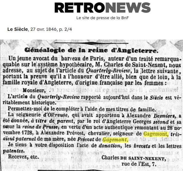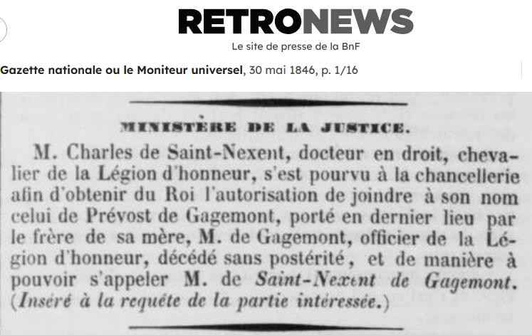 Louis Charles Auguste PRÉVOST comte de GAGEMONNé le 30/05/1785 marié le 11/11/1816 DCD 29/08/1840 à SAINT MARTIN LES MELLE (79)