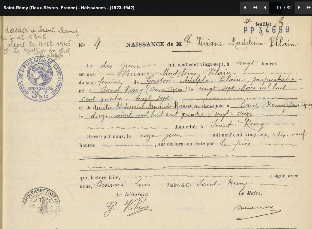 Vivianne VILAIN était l'enfant unique du couple VILAIN/REINIER (un couple de veufs) Elle avait un demi-frère |