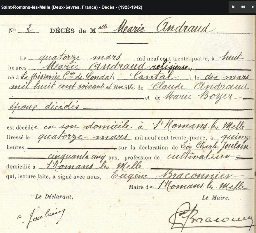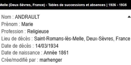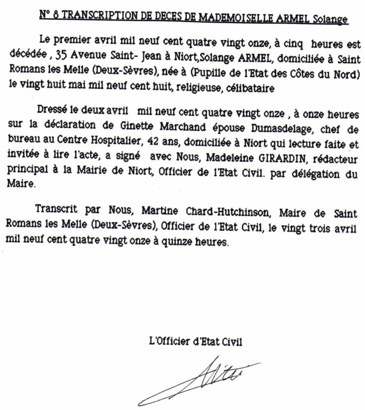 Enterrée à part car membre d'une autre congrégation : Congrégation du Saint et immaculé coeur de Jésus |