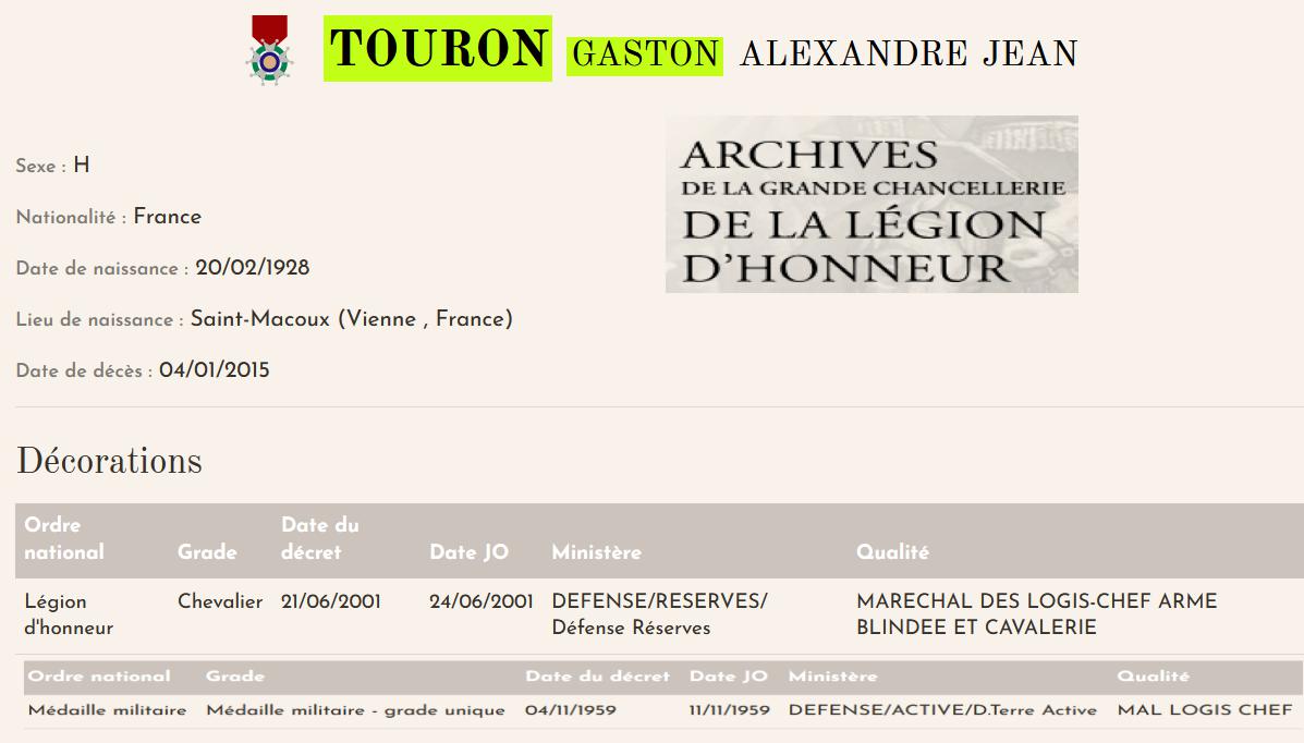 Décret du 21 juin 2001 portant promotion et nomination Touron (Gaston, Alexandre, Jean), 20 février 1928, maréchal des logis-chef, arme blindée et cavalerie. |