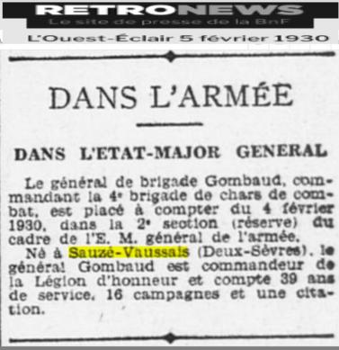 DCD le 02/03/1963 à SAUZE VAUSSAIS (79) a fini Général de brigade commandeur de la Légion d'Honneur