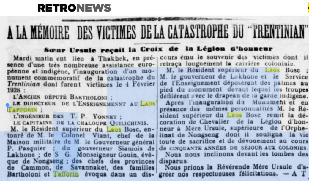 TAFFORIN Pierre chef du service de l'enseignement au LAOS DCD le 04 février 1928 au LAOS suite naufrage consécutif à une explosion du bateau qui le transportait vers Vientiane