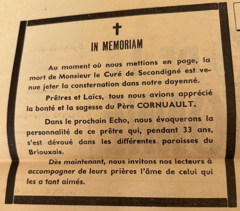ABBE HENRI CORNUAULT CURE DE SECONDIGNE S/BELLE DE 1932 A 1965 |