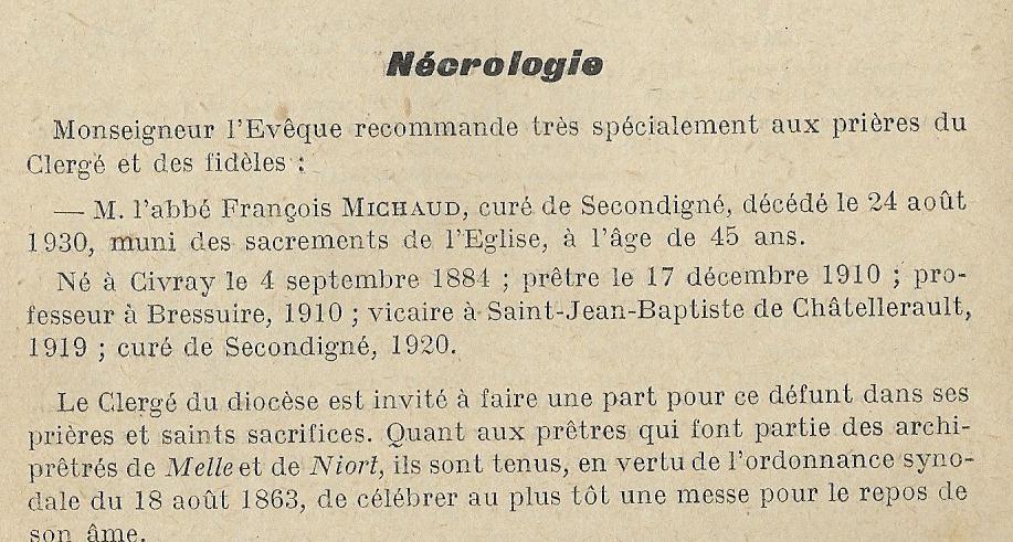 Abbé François MICHAUD né le 21/09/1884 à CIVRAY (86) DCD le 24/08/1930 à SECONDIGNE