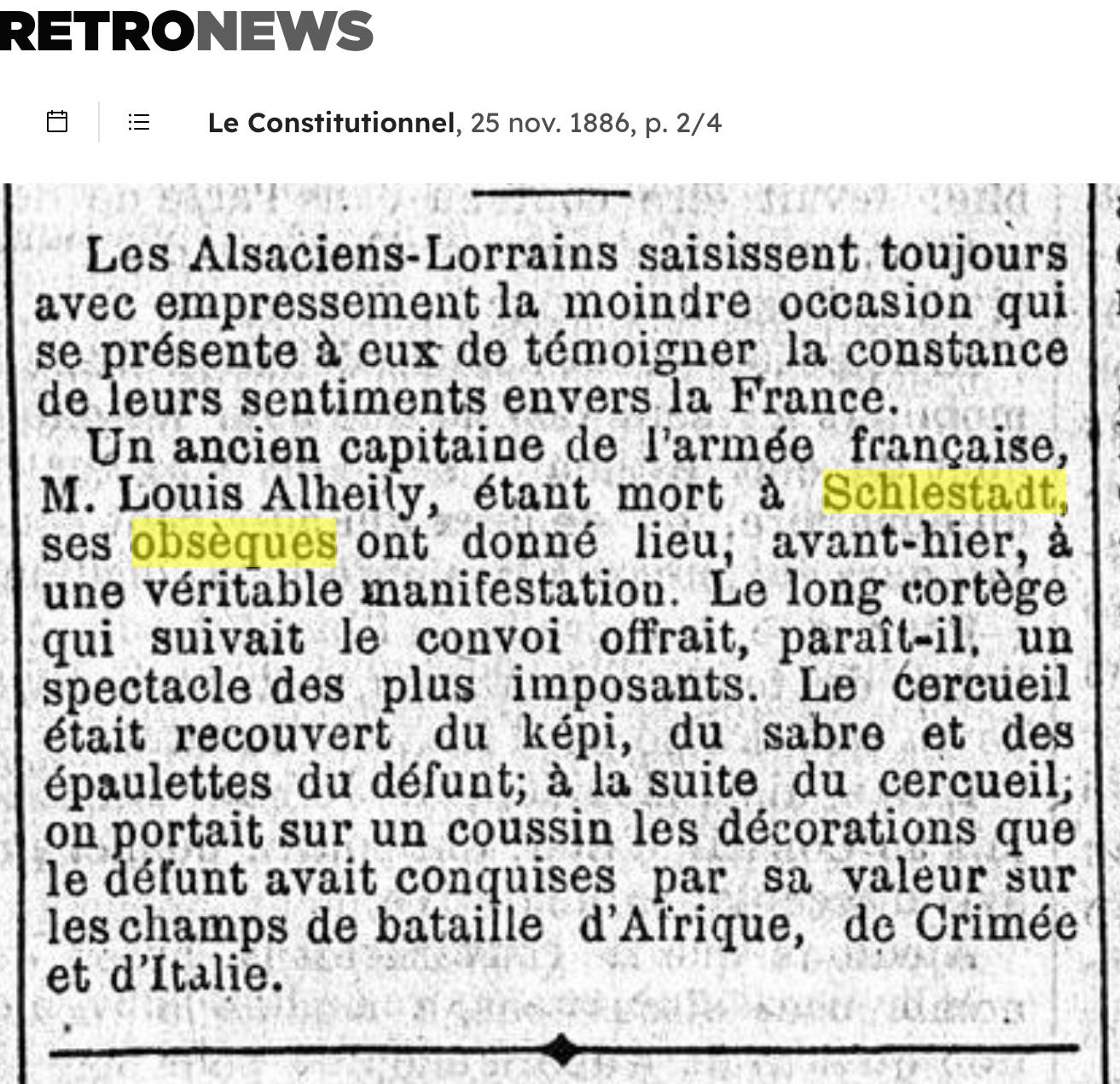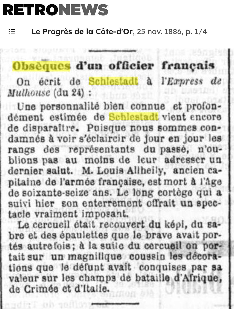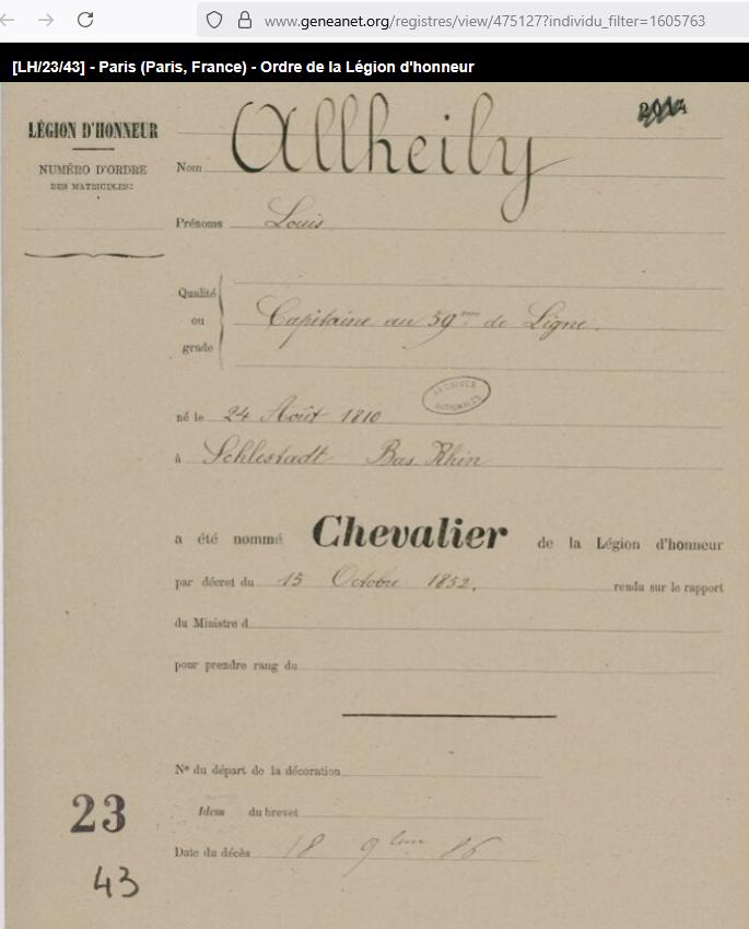 LOUIS ALLHEILY CAPITAINE EN RETRAITE CHEVALIER DE LA LEGION D'HONNEUR ET DE L'ORDRE DE PIE IX. DECORE DE LA MEDAILLE VALEUR MILITAIRE DE LA SARDAIGNE. MEDAILLE D'ITALIE. 1810 – 1886