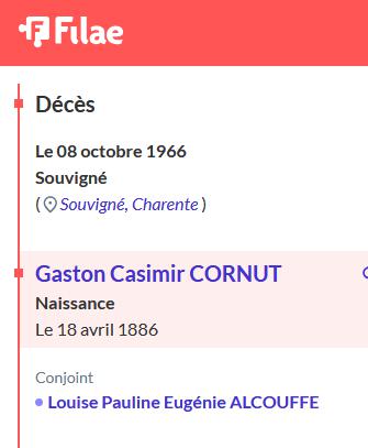 Gaston Casimir Constant CORNUT Né le 18 avril 1886 - Souvigné, 16 Gazier Parents François CORNUT, né vers 1855, décédé, Cultivateur Avec Magdeleine FAVRE, née vers 1860, décédée, Cultivatrice Union et enfant(s) Marié le 3 août 1912, Paris 13e, avec Louise Pauline Eugénie ALCOUFFE 1892-1972 dont ; Paul CORNUT 1915 x x source : |
