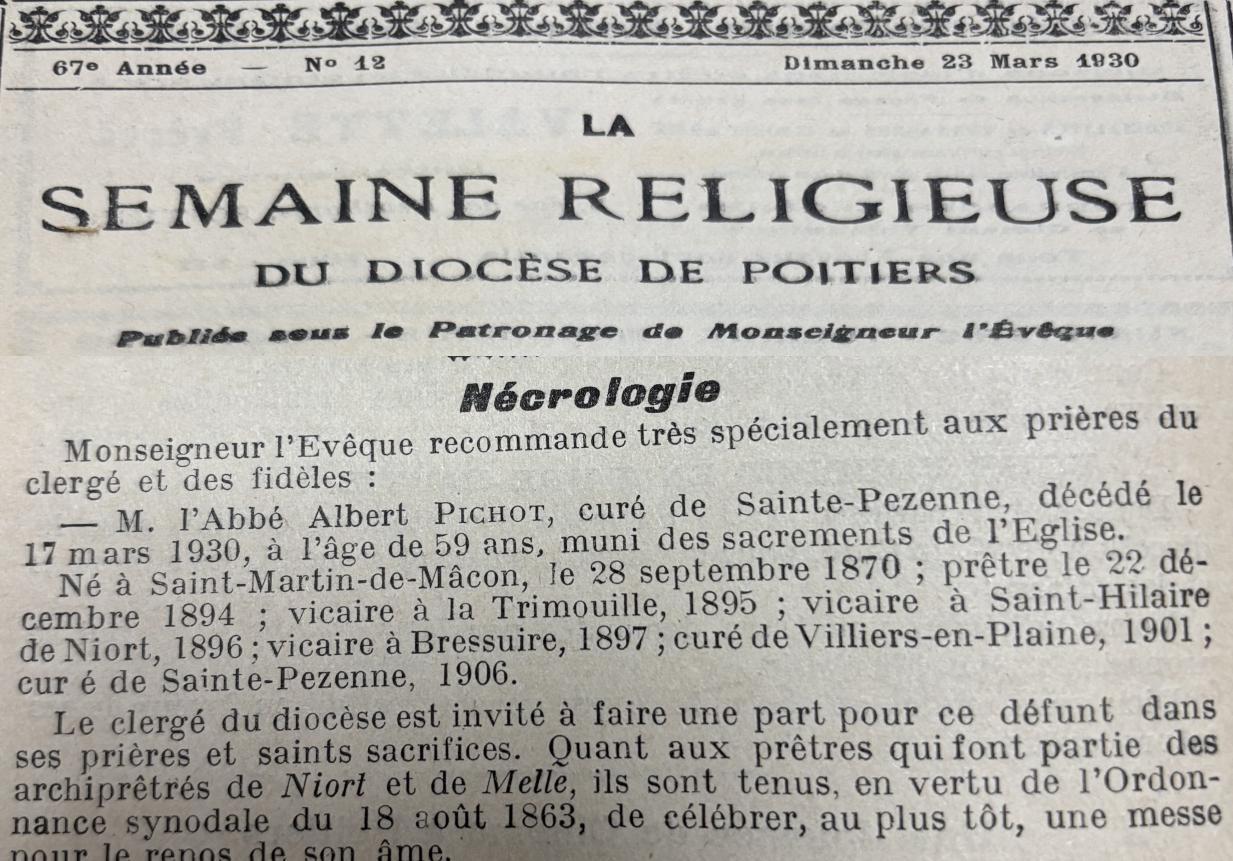 Abbé PICHOT Albert Léon né le 28/09/1870 à Chavigny de SAINT MARTIN DE MACON (79) |
