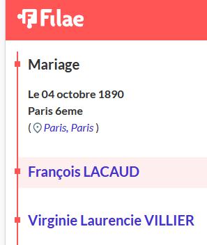Au mariage LACAUD François était gardien de la Paix à PARIS, 34 ans (environ) VILLIER Virginie était marchande bouchère à PARIS , 37 ans (environ) |