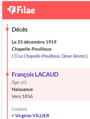 VILLIER Virginie DCD le 25/09/1913 à LA CHAPELLE POUILLOUX (79) LACAUD François, rentier DCD le 25/12/1919 à LA CHAPELLE POUILLOUX (79) |