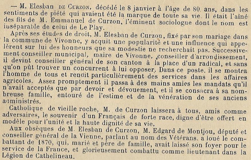 Élesban PARENT de CURZON Né le 7 novembre 1839 - Chateau de La Planche - Vivonne,86 Décédé en avril 1919, à l'âge de 79 ans Officier, Maire de Vivonne Parents Emmanuel, Marie, Vincent PARENT de CURZON 1811-1896 Hélène Marie BARBIER de La PLANCHE 1814-1875 Union et enfant(s) Marié le 6 novembre 1866, Château de Jorigny - Vivonne,86, avec Louise, GOURDON 1846- (fille de Sébastien François GOURDON) dont F Marie, Louise, Hélène PARENT de CURZON 1867-1867 H "Emmanuel", Marie, Arthur, Sébastien PARENT de CURZON 1869-1911 Marié le 5 février 1902, Vivonne,86370,Vienne,Poitou-Charentes,FRANCE, avec Alphonsine ROBERT de LA MOTHE 1867-1935 H Sébastien, Marie, Etienne, Henri PARENT de CURZON 1871-1892 F "Marie",Louise, Radegonde PARENT de CURZON 1872-1916 F Marguerite, Marie, Adèle PARENT de CURZON 1873-1910 H Henri, Marie PARENT de CURZON 1877- Marié le 27 décembre 1917 avec Marguerite, Marie-Josèphe BOUTILLIER du RETAIL 1878- F Marie-Antoinette PARENT de CURZON 1878-1955 Mariée le 11 janvier 1904, Vivonne,86370,Vienne,Poitou-Charentes,FRANCE, avec Jacques NIVARD de La RICHARDIERE 1870-1931 F Anne-Marie PARENT de CURZON 1882-1953 Mariée avec Charles RICAUME †1932 F Hélène PARENT de CURZON 1885- Mariée avec Walter POUGNET H Emmeran PARENT de CURZON 1887-1909