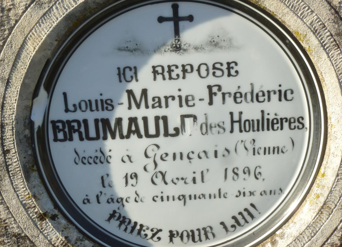ICI REPOSE Louis-Marie-Frédéric BRUMAULD des Houlières décédé à Gençais (Vienne) le 19 Avril 1896 à l'âge de cinquante six ans |